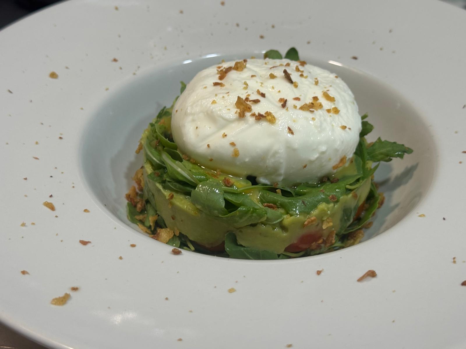 Rúcula, Crema de Aguacate, Tomate Cherry, Miel Mostaza, Pesto Verde